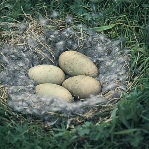 - Gewinnung: Eiderenten sind streng geschützte Tiere. Nach der Brutzeit dürfen staatlich zugelassene Sammler die Daunen aus den Nestern entnehmen. Um eine Eiderdaunendecke füllen zu können, benötigt man Daunen von mindestens 30 Nestern.